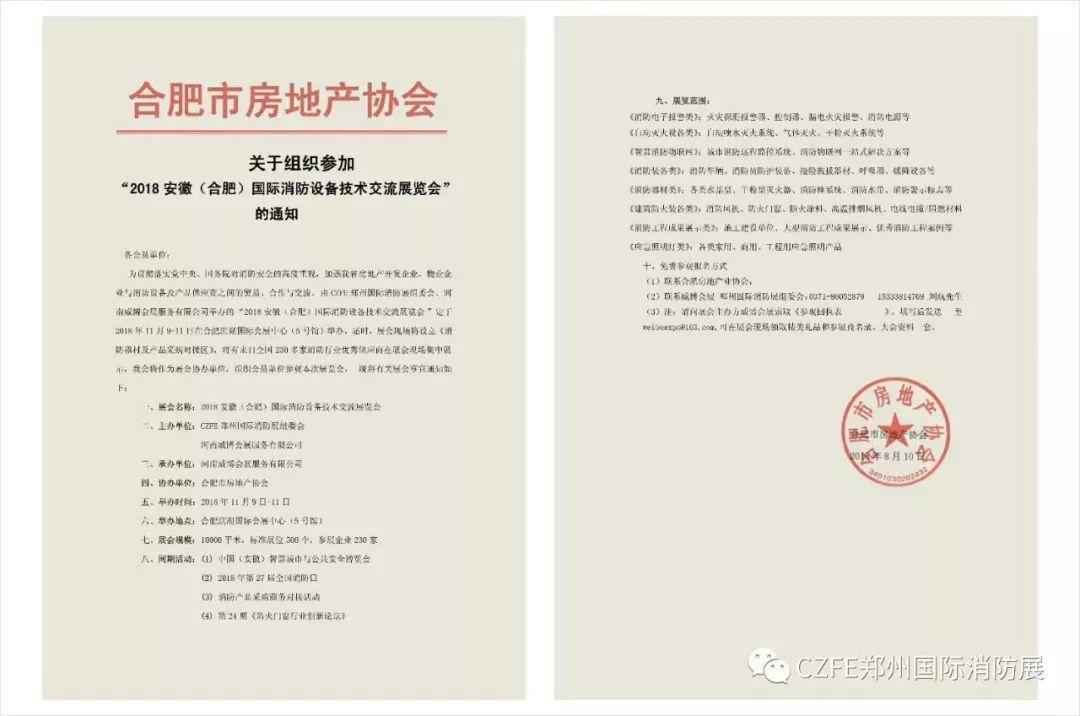 由威博會(huì)展|CZFE鄭州國(guó)際消防展組委會(huì)舉辦的“2018安徽(合肥)國(guó)際消防設(shè)備技術(shù)交流展覽會(huì)”將于2018年11月9日-11日在合肥濱湖國(guó)際會(huì)展中心(5號(hào)館)召開,合肥市房地產(chǎn)協(xié)會(huì)作為協(xié)辦單位之一直接參與消防展籌備,并下達(dá)舉辦安徽(合肥)國(guó)際消防展《通知文件》。