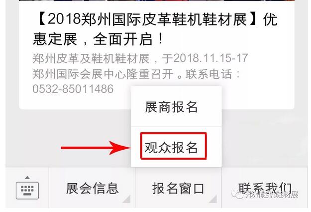 方式二:關(guān)注官方微信公眾號【鄭州鞋機(jī)鞋材展】,點(diǎn)擊微信公眾號底部菜單進(jìn)行預(yù)登記。