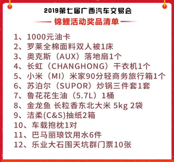 為了回饋廣大市民朋友對本屆廣西車交會的支持,車展組委會特別推出免費觀展搶錦鯉大禮包活動,凡是在3月14日中午12:00前報名觀展的用戶,均可參與抽獎。而在開展首日(3月15日12:00),車展最強錦鯉即將誕生,好玩、福利、優(yōu)惠看得見。到底誰能獨攬禮品清單中的12種好禮,讓我們拭目以待。