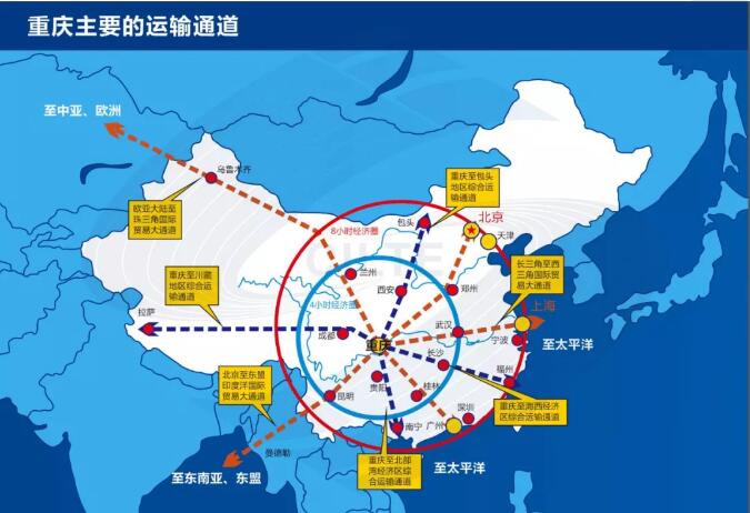 重慶是西部大開發(fā)的重要戰(zhàn)略支點,是“一帶一路”和長江經(jīng)濟帶的聯(lián)結點。重慶向東有長江黃金水道、向西有中歐班列(重慶)、向南有“國際陸海貿(mào)易新通道”、向北有“渝滿俄”班列,立足內(nèi)陸、面向國際;