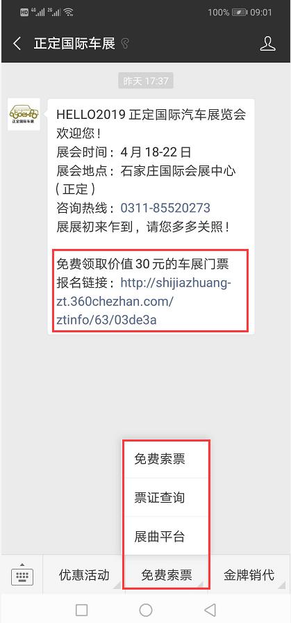 關(guān)注“正定國際車展”微信公眾號(hào),選擇“免費(fèi)索票”,輸入相關(guān)信息即可免費(fèi)獲取價(jià)值30元的車展門票;或點(diǎn)擊自動(dòng)回復(fù)報(bào)名鏈接進(jìn)行索票。