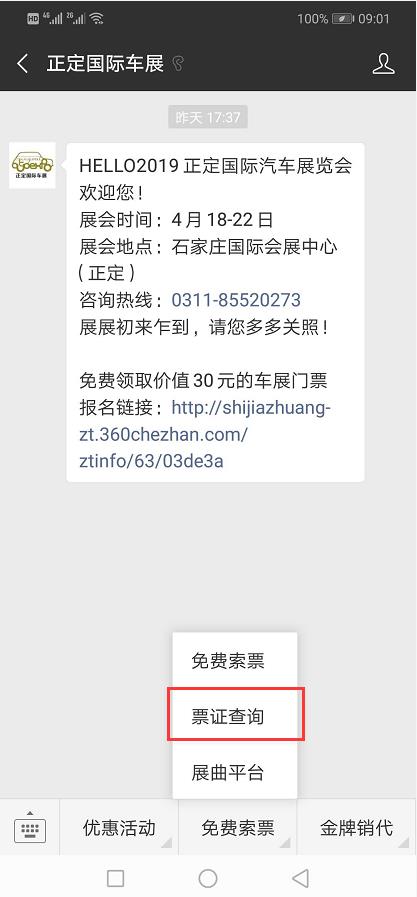 關(guān)注“正定國際車展”微信公眾號(hào),點(diǎn)擊“免費(fèi)索票”選擇“票證查詢”,輸入相關(guān)信息,即可查票。