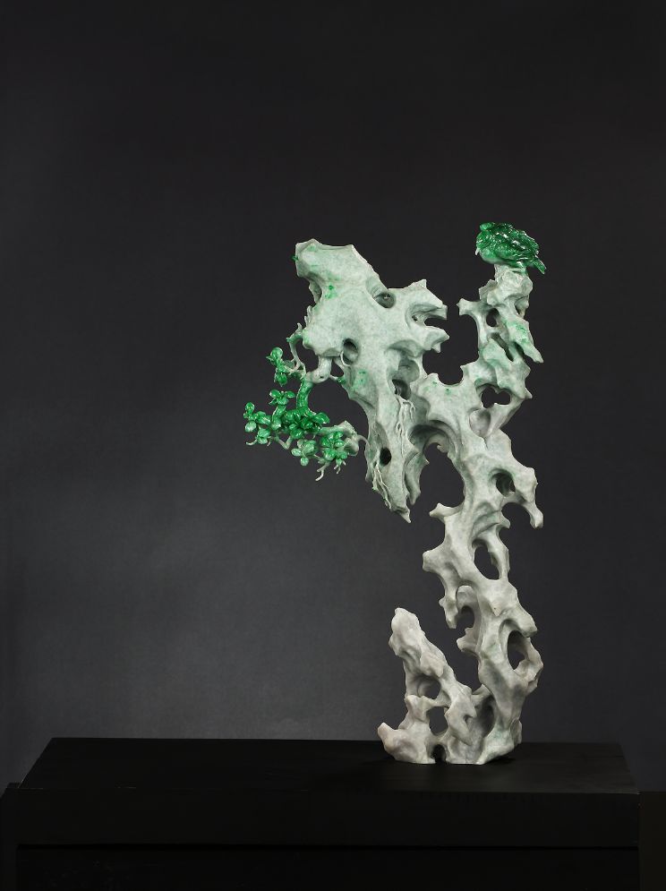 以《一樹清風(fēng)》為例看玉雕大師如何俏色巧用,作品原料為翡翠,顏色主要以不同色調(diào)的綠色為主,作品選材自然主題,巧用原料中的深綠色部分做樹木及臥鳥,其余部分做怪石狀。著重刻畫樹葉、根莖、羽毛、怪石走向等細(xì)節(jié),用顏色濃淡表現(xiàn)前后關(guān)系,凸顯立體感和真實(shí)感,以刻刀為筆,“繪制”出一副頗具國風(fēng)的工筆畫。