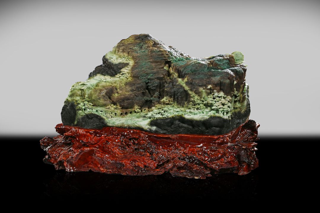 作品《巍巍太行》材質(zhì)為獨(dú)山玉,作品靈感源于自然山林。此原料為雜色獨(dú)山玉,綠、白、褐、青等顏色相互呈浸染狀或漸變過渡狀存在于同一塊體上,其塊度大,形狀似山峰。作者以此為基礎(chǔ),用巧奪天工的高超技藝雕刻出太行山勝景。借用中國山水畫中散點(diǎn)透視,高遠(yuǎn)、深遠(yuǎn)、平遠(yuǎn)的“三遠(yuǎn)”表現(xiàn)手法,巧用顏色體現(xiàn)前后關(guān)系以及畫面立體感。近處的樹林、橋梁、牛群、流水;遠(yuǎn)處的庭閣、房屋、小路、云彩,以淺色表現(xiàn),比例適當(dāng)、線條流暢、細(xì)節(jié)處理到位傳神,能抓住觀者第一視角。以褐、棕色表現(xiàn)山脈,突顯山脈的陡峭層疊、莊重巍峨之感,太行山的大氣磅礴與山中生活意境之美完美呈現(xiàn)。