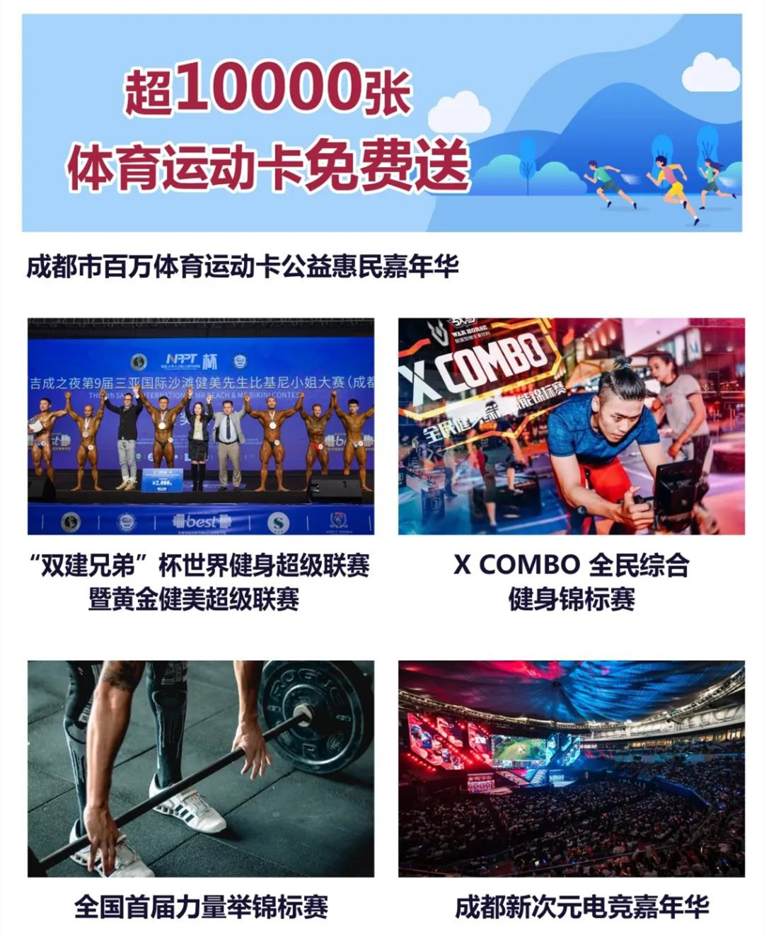 它還有2020xcombo綜合健身錦標(biāo)賽、成都新次元電競嘉年華等更多面向全成都體育運動愛好者的賽事活動,以及面向青少年的體育運動培訓(xùn),面向健身康體、戶外運動、場館設(shè)施企業(yè)的展覽展示,將打造一場全民參與,全民共享的體育運動狂歡盛宴。