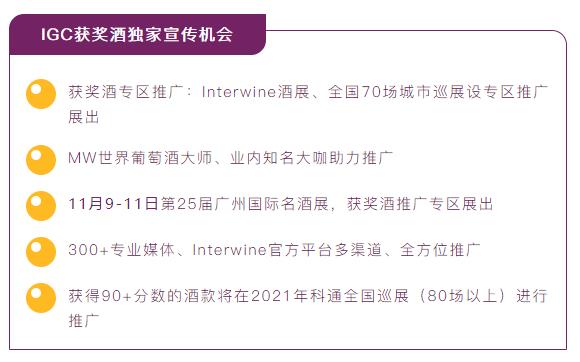 Interwine是中國最早、影響力最大的專業(yè)國際葡萄酒及烈酒展覽,旗下Interwine 葡萄酒與烈酒大獎(jiǎng)賽(簡稱IGC)作為中國最權(quán)威公正的葡萄酒大賽之一,對(duì)中國葡萄酒消費(fèi)市場影響深遠(yuǎn)。IGC旨在對(duì)釀酒廠商勤懇勞作進(jìn)行表彰加冕,全力幫助進(jìn)入中國市場的國內(nèi)外酒商建立起自己的品牌知名度和美譽(yù)度,搭建釀酒者和消費(fèi)者之間的互聯(lián)互通的橋梁,推動(dòng)國際和國內(nèi)葡萄酒行業(yè)向前發(fā)展。2020 IGC已正式啟動(dòng),參賽酒款現(xiàn)正征集中。