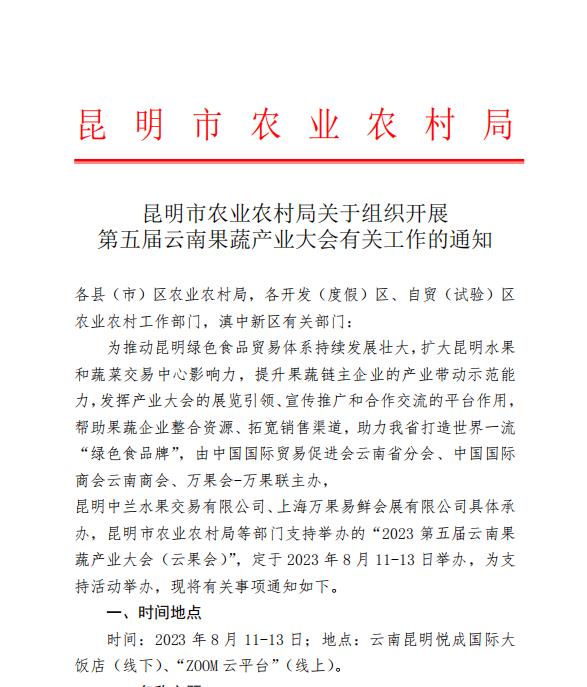 昆明市農(nóng)業(yè)農(nóng)村局關(guān)于組織開展第五屆云南果蔬產(chǎn)業(yè)大會(huì)的通知